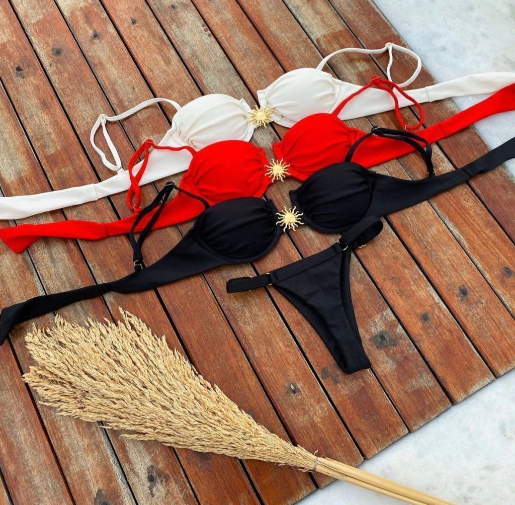 Top meia taça com bojo removível e alça removível, possui argola orgânica; Amarração nas costas para melhor ajuste ao corpo.